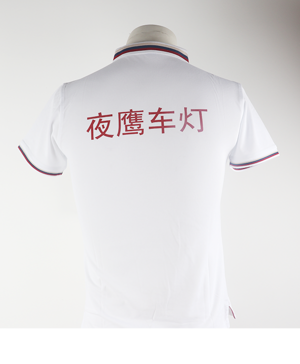 同時(shí)在胸前和后背印制紅色logo:夜鷹車燈,提高了企業(yè)的識(shí)別度,logo大小位置顏色經(jīng)過(guò)了幾次修改調(diào)整,不會(huì)顯的突兀同時(shí)又能完美體現(xiàn)企業(yè)標(biāo)識(shí)。