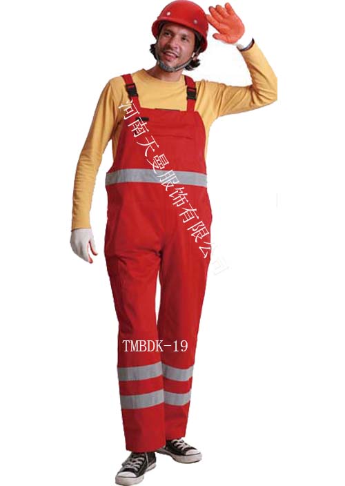 Fabrics: T/C 16*12,108*56,260-270 gsm;waist adjustable;one breast pocket with flap, two slash pocket, back patch pocket,elasticated bib bands, one 5CM reflective strip around the body and two of them around each leg.