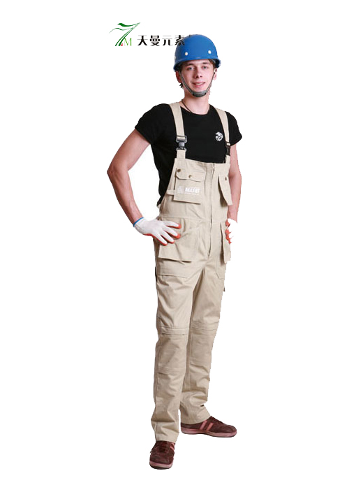 面料:T/C 20*16,120*60,235-245 gsm;Logo繡花標志在前胸部位,兩個胸兜,兩個斜插褲兜,多個工具袋;工具掛環(huán);塑脂拉鏈;背帶松緊帶并有卡扣可以調(diào)節(jié)背帶長度。